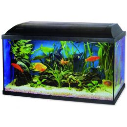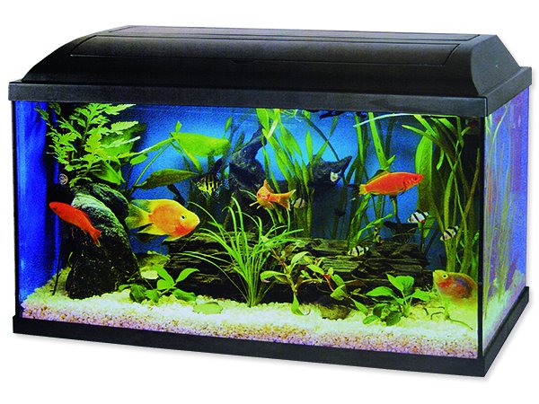 Bohatě vybavené akvárium které obsahuje snímatelný osvětlovací kryt s 2 x 30 W zářivkou a uzavíratelným otvorem pro krmení ryb,