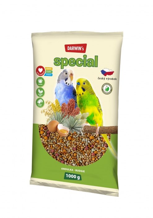 Jakostní znaky: DARWINS Special - andulka 1kg, vlhkost 13%, vitamín A 10.000 m.j.,vitamín D3 500 m.j. vitamín E 50 mg, měď 10 mg.