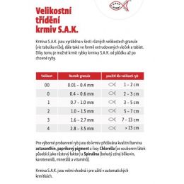 Krmná dávka: Krmte vícekrát denně maximálně tolik, co ryby spotřebují do třiceti minut. Rybky nepřekrmujte. Krmivo je určeno pro všechny druhy akvarijních ryb, dle velikosti krmiva a druhu ryb je možné krmit rybky od plůdku až po chovné ryby.
