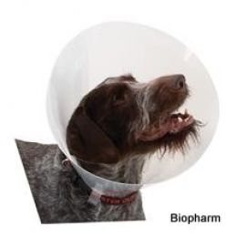 Transparentní plastový ochranný límec pro psy po veterinárním ošetření nebo po zranění, který znemožňuje psovi lízání a okusování ran, vytahování stehů apod. Límec ochrání celé tělo včetně hlavy a končetin.