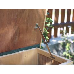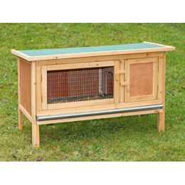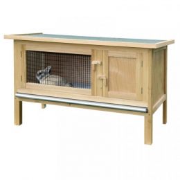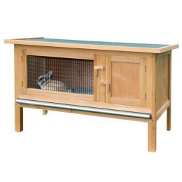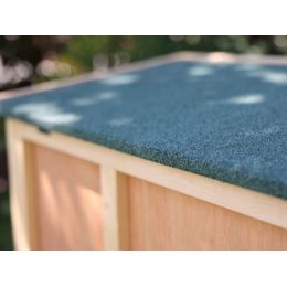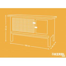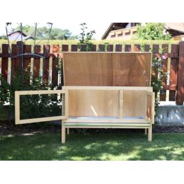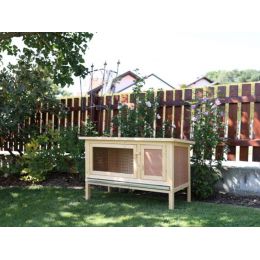 rozměry 100 x 45 x 62 cm, vnitřní výška 40 cm, pozinkovaná vytahovací vana, čelní strana je opatřena drátěnou mřížkou a dřevěnou deskou, dvoje otevírací dvířka, odklápěcí střecha s asfaltovými šindeli, lze použít i v exteriéru, průlezný otvor do klidové zóny, baleno v kartonu, dodáváno v rozloženém stavu, snadná montáž.