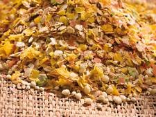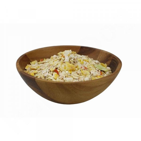 celozrnné kukuřičné vločky, kukuřičná mouka (válcově sušená), celozrnné pšeničné vločky, celozrnné ovesné vločky, hrachové vločky (6 %), dikalcium fosfát, mrkev sušená (2 %), uhličitan vápenatý, proso drcené, rýžová mouka extrudovaná, chlorid sodný, plody černého bezu sušené, hroznová matolina, saturejka, majoránka, plody anýzu, bazalka, plody fenyklu, květ černého bezu, květ levandule, rozmarýn, šalvěj, tymián. (Bylinky celkem: 0,15 %) Stravitelná energie: 1.430 KJ/100 g; 3.420 Kcal/kg.