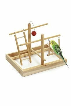 Hračka hřiště. Andulky potřebují zábavu. Tato dřevěná hračka u nich vyvolá zájem. Obsahuje žebřík, houpačku a balónek.