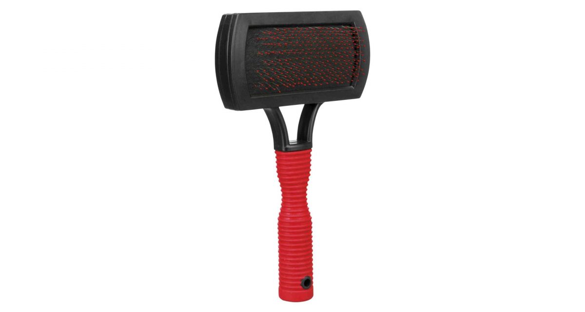 Kartáč s gumovou rukojetí a kovovými drátky na vyčesávání línajících chlupů.