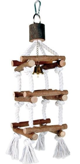Závěsná věž z provazů a dřevěných dílů pro andulky a kanáry.
