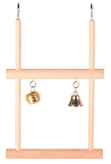 Dřevěná houpačka se dvěmi bidýlky a zvonky.