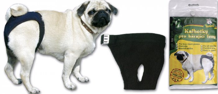 Materiál kalhotek je zvolený pro časté ruční praní. Kalhotky nesmí fenu obtěžovat, proto je obvodový lem pružný, zapíná se na kovovou sponu.