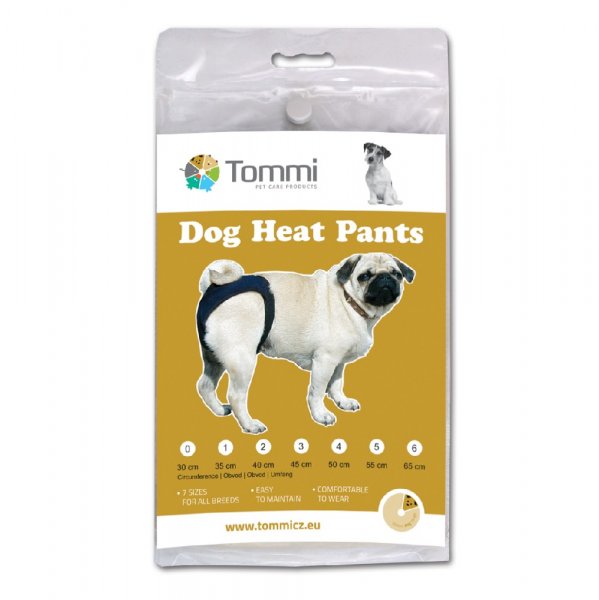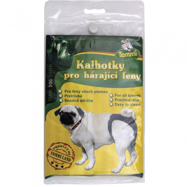 Materiál kalhotek je zvolený pro časté ruční praní. Kalhotky nesmí fenu obtěžovat, proto je obvodový lem pružný, zapíná se na kovovou sponu. Jen správná velikost kalhotek zajistí jejich funkčnost, proto dodáváme na trh 7 velikostí s orientačním návodem k výběru správné velikosti.