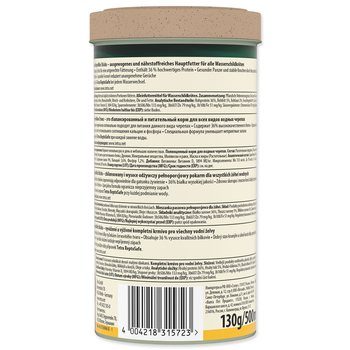 Složení: obiloviny, ryby a vedlejší rybí výrobky, kvasnice, rostlinné bílkovinné extrakty, minerální látky, měkkýši a korýši, maso a vedlejší živočišné výrobky, mořské řasy, oleje a tuky, lecitin.