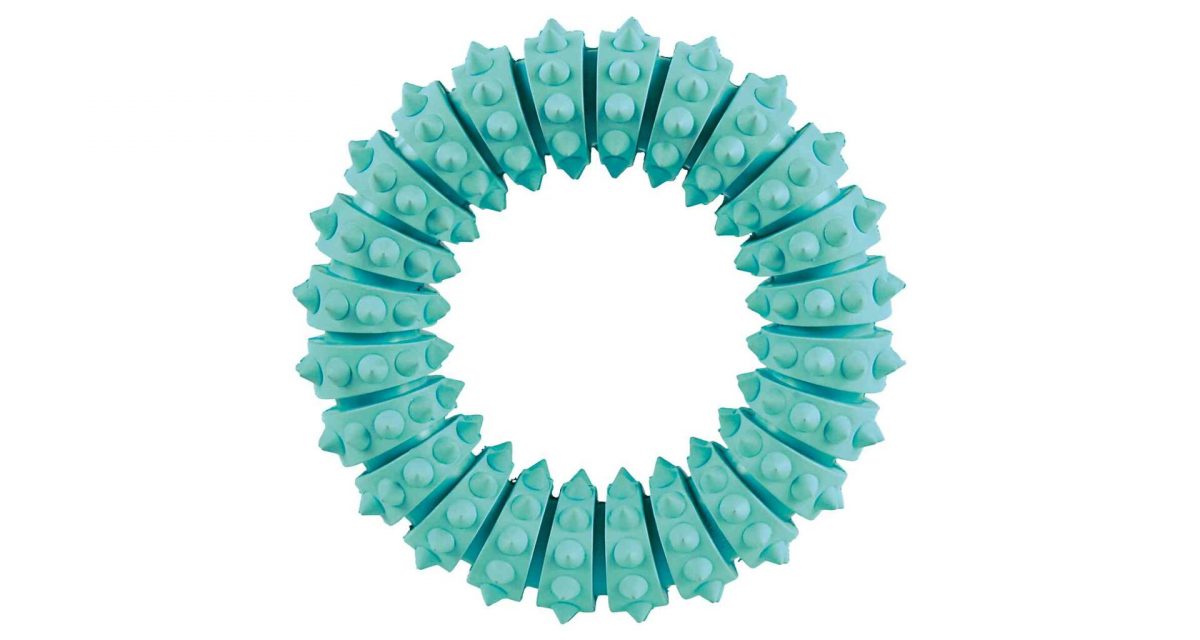 Výstupky na kroužku pomáhajíodstranit zubní plak a masírují psovidásně. Kroužek je navíc napuštěň extraktem z máty, a tak osvěžuje dech psa. Materiál - přírodní guma.