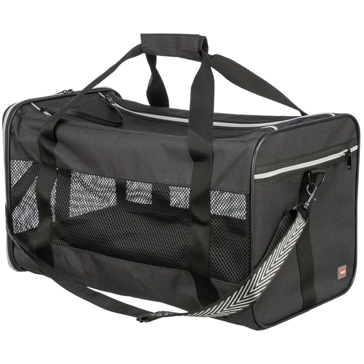 Umožňuje otevírání shora či zepředu. Taška je ve střední části zhotovena z pevné prodyšné síťoviny pro volný přísun čerstvého vzduchu. Uvnitř tašky je krátké nylonové vodítko. Pohodlné nošení zajišťuje polstrovaný odnímatelný popruh, který lze délkově nastavit.