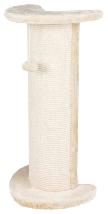 Rohové luxusní škrabadlo pro kočky s hračkou na provázku. Béžové, škrabací plocha je sisalová, okraje a zadní strana plyšová. Rozměry 37x27x výška 75 cm.