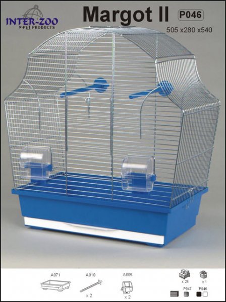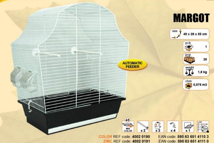 Součástí klece je základní vybavení (2 x krmítko, 2 x bidýlko). Dno klece má výsuvný šuplík, díky němu je čištění snadnější a pohodlnější. 1 x dvířka na přední straně.