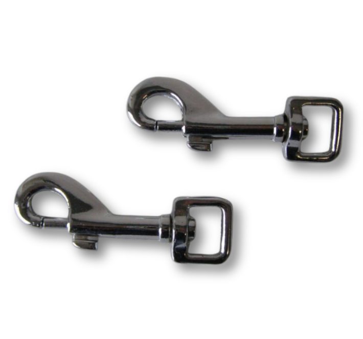 Klasická háková odlitá pochromovaná karabina s otočně uloženým okem pro připevnění k vodítku.