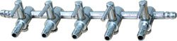 Nerezová rozvodnice pro větvení rozvodů vzduchu v provedení s neobyčejně jemnou regulací množství procházejícího vzduchu prostřednictvím vestavěných kohoutů. Počet vývodů: 5
