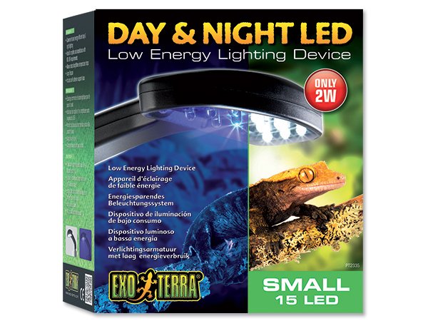Exo Terra ® Day & Night LED nabízí nejpohodlnější a nejefektivnější způsob, jak osvětlit vaše terárium během dne i noci.. Běžné žárovky produkují více než 80% použité energie ve formě tepla. Oproti tomu, Exo Terra ® Day & Night LED svítí vaše terárium s minimem zbytkového tepla a zajišťuje maximální světelný výkon. Téměř úplná absence vzniku tepla snižuje riziko přehřívání během letní sezóny a umožňuje přírodní pokles teploty během noci. U plazů, obojživelníků a bezobratlých s vyššími požadavky na teploty, by měly být součástí terária doplňkové zdroje tepla. Osvětlení LED Exo Terra Day ® & Night LED spotřebuje méně energie a má delší životnost ve srovnání s konvenční žárovky a zářivky.