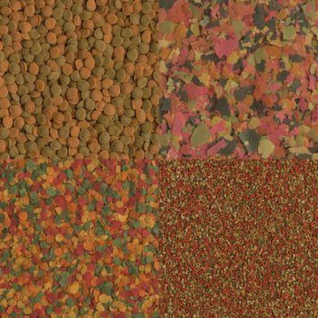 4 druhy krmiva pro rybky žijící a stravující se v různých úrovních akvária. Kompletní krmivo pro akvarijní ryby.