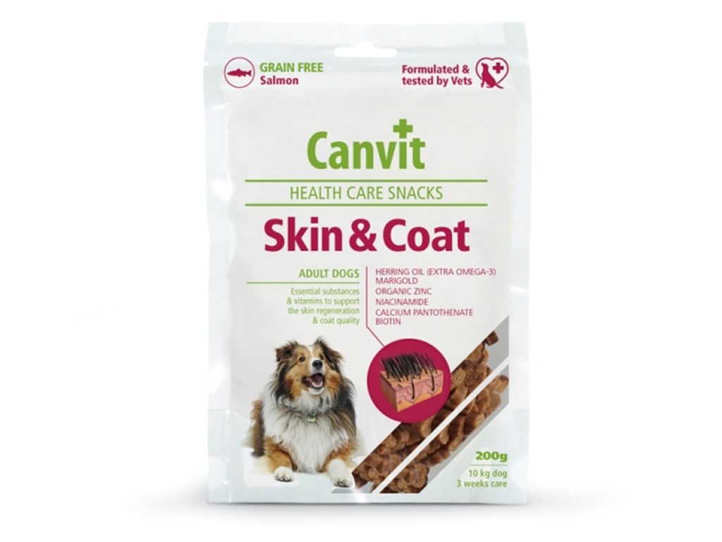 Canvit Snack Skin & Coat pro psy jsou extra chutné pochoutky pro psy s masem z lososa 15 % a obohacené o sleďový olej 6 %, biotin, zinek, nenasycené mastné kyseliny, kolagen a další důležité vitaminy a mikroprvky pro intenzivní péči o kůži, srst a drápky psa. Funkční masové pamlsky jsou bez obilovin, dochucovadel a vhodné pro každodenní podávání všem kategoriím psů. Pamlsky jsou bez obilovin, a díky tomu vhodné i pro psy s citlivým zažíváním a pro psy s potravní alergií nebo intolerancí. Pamlsky se dávají psovi přímo z ruky během dne jako odměna. Snack pochoutky urychlují výměnu srsti v období línání a podporují růst nové zdravé a lesklé srsti. Jsou vhodné při intenzivní péči o zdraví kůže při zánětech kůže, svědivosti, výskytu lupů, suchosti a podporují rychlou obnovu třepivých nebo poškozených drápků. Komplexní složení zajišťuje rychlý nástup účinku a pozorovatelné změny na stavu kůže a srsti již po několika dnech užívání. Obsah balení 200 g obsahuje 250 chutných masových kostiček a pro psa o váze 10 kg vydrží na 25 dní.