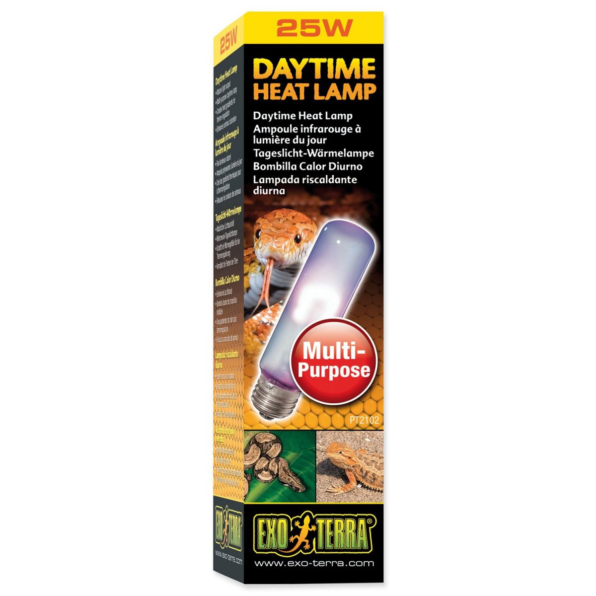 Široké spektrum denního světla s neodymovým povrchem.Spektrum je ideální pro fotosyntézu rostlin a UVA (ultrafialové) záření přispívá plazům k fyziologické pohodě. Dalším důležitým faktorem je teplo vydávané žárovkou zvýšené nad všechny okolní teploty v teráriu.