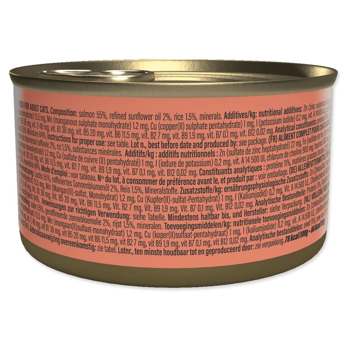 losos (69%), rýže (1,2%), pitná voda, paprikový výtažek.