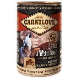Jedinečná masová konzerva Carnilove pro dospělé psy. Skládá se z kombinace jehněčího a kančího masa, borůvek, malin a brusinek. Žádné obiloviny, brambory ani sója. Jehněčí a divočák tvoří perfektní kombinaci proteinů, bohatou na přirozené živiny. Jehněčí je zdrojem stopových prvků, zejména selenu, železa, zinku a vitaminů skupiny B a nenasycených tuků. Maso z divočáka je velmi bohaté na proteiny a zároveň má nízký obsah tuku, proto přispívá k udržení perfektní kondice a nezvyšuje hladinu krevního cholesterolu. Lahodné krmivo, které můžete podávat společně s granulemi nebo i samostatně.