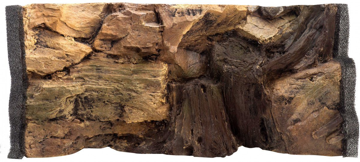 Velmi pěkně propracované akvarijní pozadí, kde je kořen zapracován do kamenného či skalnatého břehu. Na obyvatele akvária působí příjemně a teple. Dekorativní pozadí neuvolňuje do vody žádné škodlivé látky! Pozadí je opatřeno síťkou ze zadní části, která znemožní proniknutí rybky za tuto dekoraci a snadněji se v akváriu upevní.