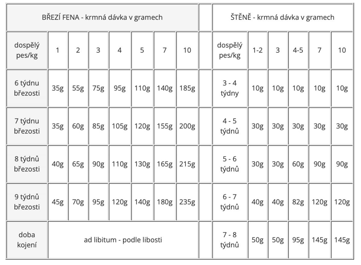 Pro štěňata od 3 týdnů, namočte do teplého mléka nebo vody několik minut před krmením. Denní krmná dávka by měla být rozdělena do 3 – 4 porcí a může být měněna s ohledem na potřeby štěněte. Březí a kojící feny od 6 týdnů březosti. Vždy zajistěte čerstvou vodu.