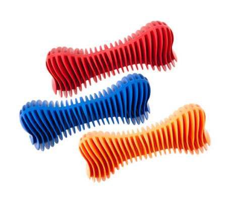 Dentální hračka pro psy - žebrovaná kost. díky svému tvaru stírá plak ze zubů během hry. Napomáhá tedy denální hygieně.