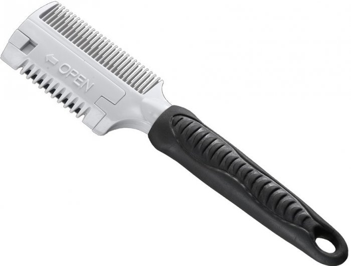 FERPLAST prořezávač je oboustranný hřeben s břitvou, užitečný pro stříhání všech typů psů. Má pevnou rukojeť se dvěma různě velkými plastovými hřebeny. Prodává se kompletní s čepelí.