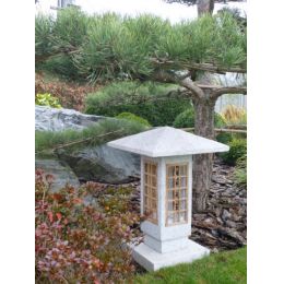 Sosakua (,,sosakua“): lampy malých rozměrů do malých zahrad. Čisté tvary kombinace dřeva a kamene. Ovory dílu pro umístění světla jsou kryté dřevěnou mřížkou.