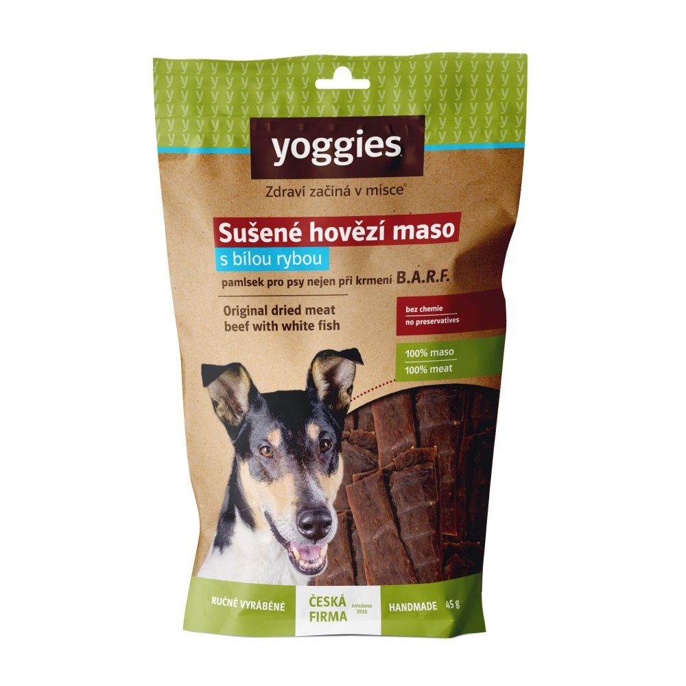 Sušené proužky voňavého českého hovězího a rybího masa bez jakékoliv chemie neodmítne žádný pes - ani ten seberozmlsanější. Balení obsahuje 50g kvalitního hovězího a rybího masa masa pro psy. Baleno jako proužky vhodné pro větší psy Novinka mezi zdravými pamlsky pro psy. 50g špičkového českého sušeného hovězího a rybího masa, porcovaného na proužky o velikosti ca 2cm šíře a 10cm délky vhodné pro větší psy Vyrobeno v ČR bez jakýchkoliv lákadel, přísad a chemie, pouze s přírodní chutí a vůní sušeného syrového masa. Vhodné pro střední a větší plemena psů. Podávání: Yoggies sušená masa jsou určena pro psy všech věkových kategorií, velikostí i rasy. Lze podávat v libovolném množství, avšak dávkováním nenahrazujte vyvážené kompletní krmivo pro psy...klidně ochutnejte Sušené maso pro psy Yoggies je masný, tepelně opracovaný výrobek. Skladování: Skladujte při pokojové teplotě, nebo v chladu. Případné malé bílé skvrny nejsou na závadu výrobku. Jedná se o přírodní, vysrážený tuk. Pamatujte, že by Váš pes měl mít k dispozici vždy dostatek čerstvé vody. Nezapomeňte že - Zdraví začíná v misce®