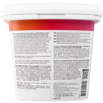 hrubý protein 24 %, hrubé oleje a tuky 24 %, hrubý popel 7 %, vlhkost 3,5 %, vápník 0,8 %, fosfor 0,7 %, sodík 0,5 %, hořčík 0,16 %, draslík 1,5 %, dokosahexaenová kyselina (DHA) 0,1 %, laktóza 42 %, omega-3 mastné kyseliny 0,1 %.