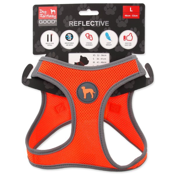Velikost přes hrudník: 46-53 cm. Barva: oranžová, Druh materiálu postroje: Nylonový, Typ postroje: Bezpečnostní, Pro štěňata, Reflexní, Sport, agility