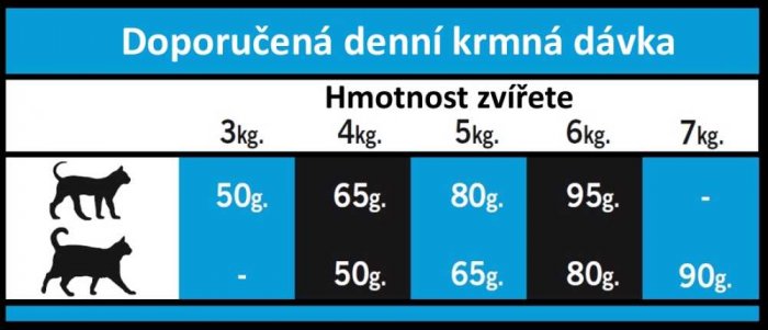 Doplňkové látky v 1 kg: Vitamín A 19.000 M.J. / mg. Vitamín D3 1.600 M.J. / mg. Vitamín E 600 mg. Vitamín C 65 mg, L-taurin 1.000 mg, L-karnitin 240 mg, DL-methionin 500 mg, železo (síran železnatý monohydrát) 195 mg, jód (jodid draselný) 3,5 mg, měď (síran mděďnatý pentahydrát) 10 mg, mangan (síran manganatý monohydrát) 9 mg, zinek (oxid zinečnatý) 150 mg, selen (seleničitan sodný) 0,23 mg, citrusové extrakty bohaté na bioflavonoidy 1000 mg, extrakt z juky 150 mg, konjugovaná kyselina linolová 26 mg.