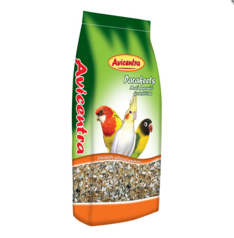 Krmná směs pro papoušky Agapornis. Složení: proso žluté, lesknice, proso bílé, oves nahý, proso červené, kardi, pohanka, semenec, len, černý oves, niger, paddy rýže.