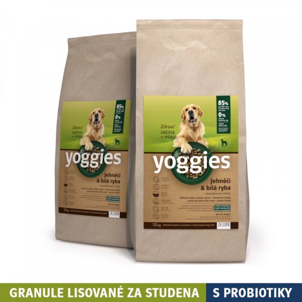 Hlavní suroviny_ jehněčích granulí Yoggies jsou kvalitní jehněčí maso a maso bílé ryby (žádná masokostní moučka). Díky těmto hlavním surovinám jsou granule skvěle stravitelné a je možné je po poradě s veterinářem používat i při různých potížích u psů jako je např.cukrovka, problémy s trávením, játry, ledvinami i při různých dietách.