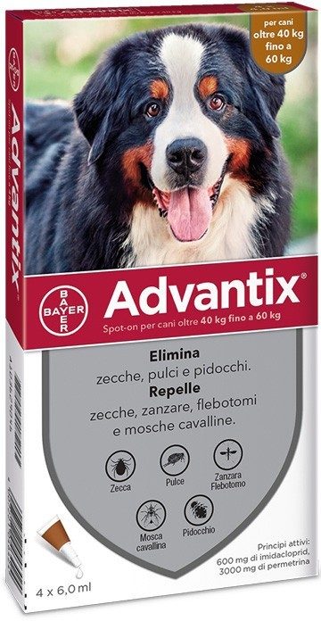 Psi (kg živé hmotnosti) Název přípravku Balení (ml) Imidakloprid (mg/kg živé hmotnosti.) Permethrin (mg/kg živé hmotnosti.) >40 kg £ 60 kg Advantix spot-on roztok pro psy od 40 kg do 60 kg 6,0 ml 10 - 15 50 - 75