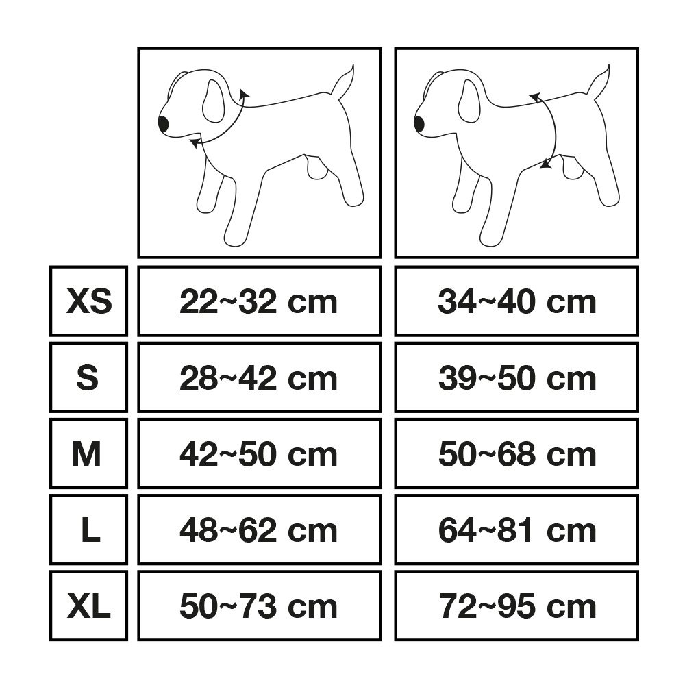 Velikost S: určena pro psy s obvodem krku 28-42cm, obvodem těla 39-50cm