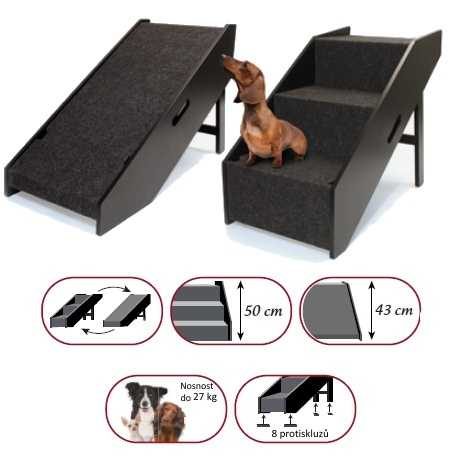 Schůdky / rampa pro psy. Dřevěná oboustranně použitelná pomůcka pro velmi malé nebo starší psy. pomáhá k překonání výškového rozdílů. Samostaně stojící. Lze využít jako rampu nebo jako schody. Barva: černá, Materiál: Dřevo
