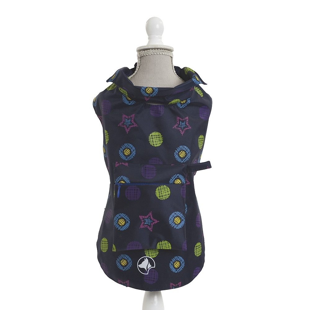 Elegantní pláštěnka pro psa potištěná motivem barevných koleček na šedém podkladu. Podšitá.