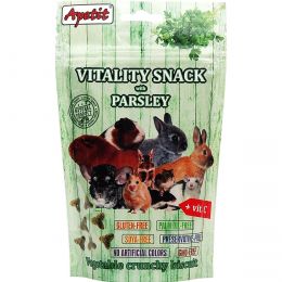 - Vyrobeno v České republice. Obsahuje vysoký podíl naťové petržele, která je přirozeně bohatá na draslík, vápník, hořčík, mangan, železo a chlór, provitamin A a vitaminy skupiny B. Obsahuje také množství vitaminu C, který je důležitý především pro morčata. Petržel působí močopudně, má silný očistný a dezinfekční účinek. Příznivě ovlivňuje zažívání a podporuje chuť k jídlu. Podporuje činnost žaludku a upravuje správné trávení zároveň působí proti nadýmání a zlepšuje krevní oběh. Krmný návod: přidávejte jako přídavek ke krmivu pro zpestření krmné dávky (pochoutka za odměnu), dávkování maximálně do 25% krmiva, zajistěte zvířeti dostatek pitné vody.
