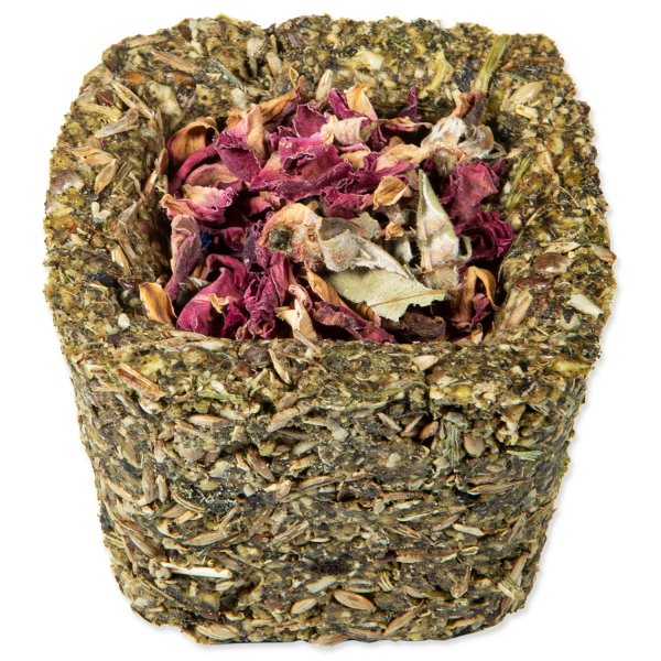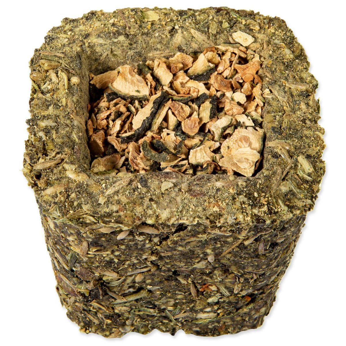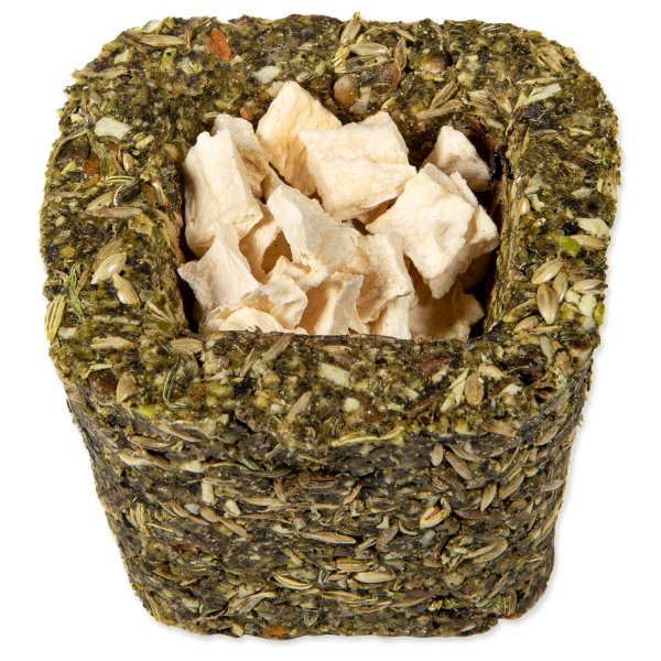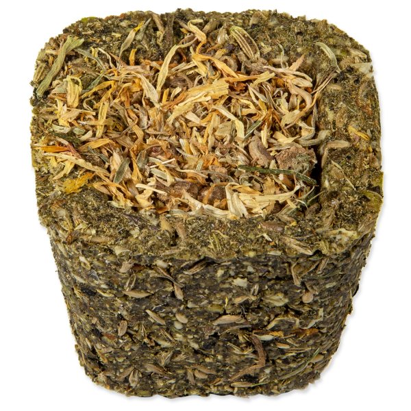 Složení: hrách, škrob, semena travin, semena kanárských travin, sušené kopřivy 4,8%, pohanka, sušená petržel 1,8%, sušená mrkev 1,7% Náplň (sušená mrkev 0,4%/ sušený pastinák 0,4%/ sušená cuketa 0,4%/ sušené okvětní lístky růže 0,3%/ sušené květy měsíčku lékařského 0,3%/ sušené květy chrpy 0,3%), konopné semeno, lněné semeno, semena fenyklu, sušená máta peprná 1,2%, sušená pampeliška 1%, semena černého kmínu.