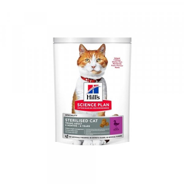 Obsahuje vysoce kvalitní, snadno stravitelné ingredience. Je klinicky prokázáno, že přidaný L-karnitin kočky pomáhá udržet štíhlé a aktivní Kontrolovaný obsah minerálních látek pro zdravý močový systém Nízký obsah tuku a vysoký obsah L-lysinu pro udržení vitality Po kastraci mohou kočky začít přibírat na váze a mají také vyšší riziko problémů s močovým systémem. Zároveň se jim zvýší chuť k jídlu a sníží spotřeba energie. Hill´s Science Plan Sterilised Cat vaší kastrované mladé dospělé kočce nabízí jedinečnou recepturu pro regulaci hmotnosti, aby zůstala štíhlá. Granule s kachnou pro mladé dospělé kočky pro udržení hmotnosti a zdravý močový systém po kastraci. S lehce stravitelnými surovinami, vysoce kvalitními bílkovinami, omega-3 a -6 mastnými kyselinami pro zdravou imunitu.