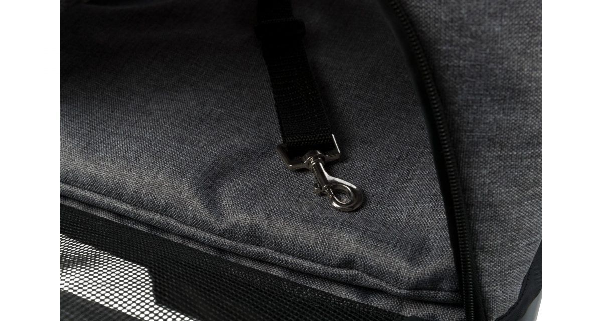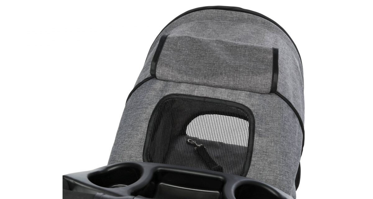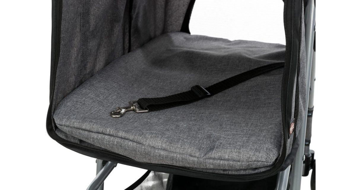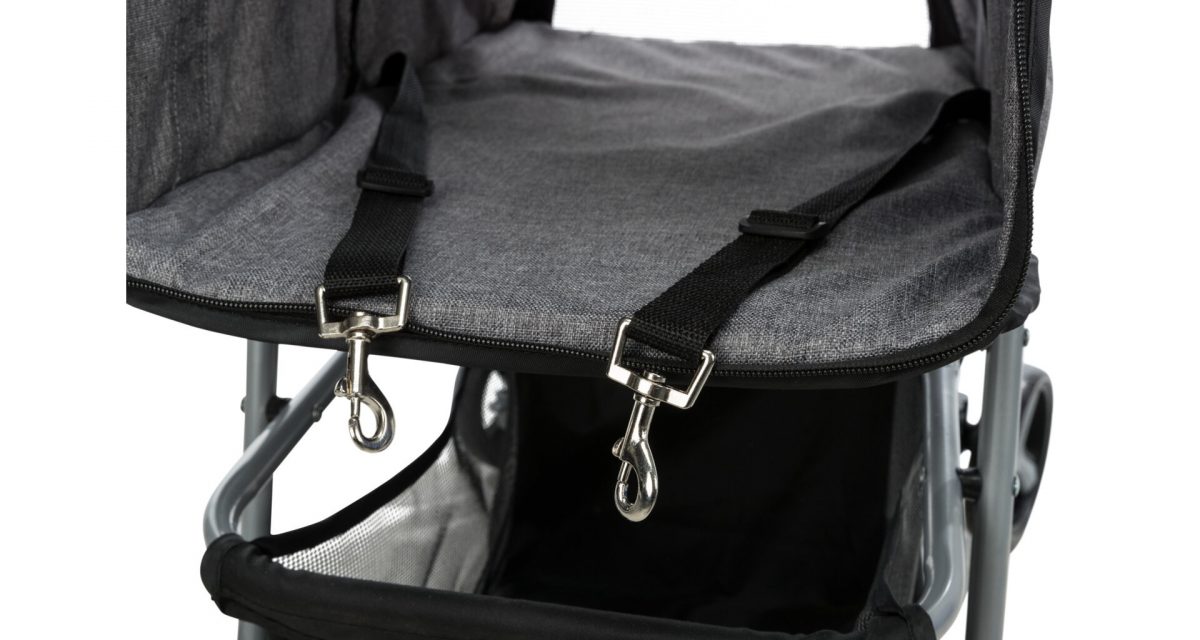 - uvnitř kočárku jsou dva krátké úvazky s karabinou, zamezující nechtěnému vyskočení psa z kočárku