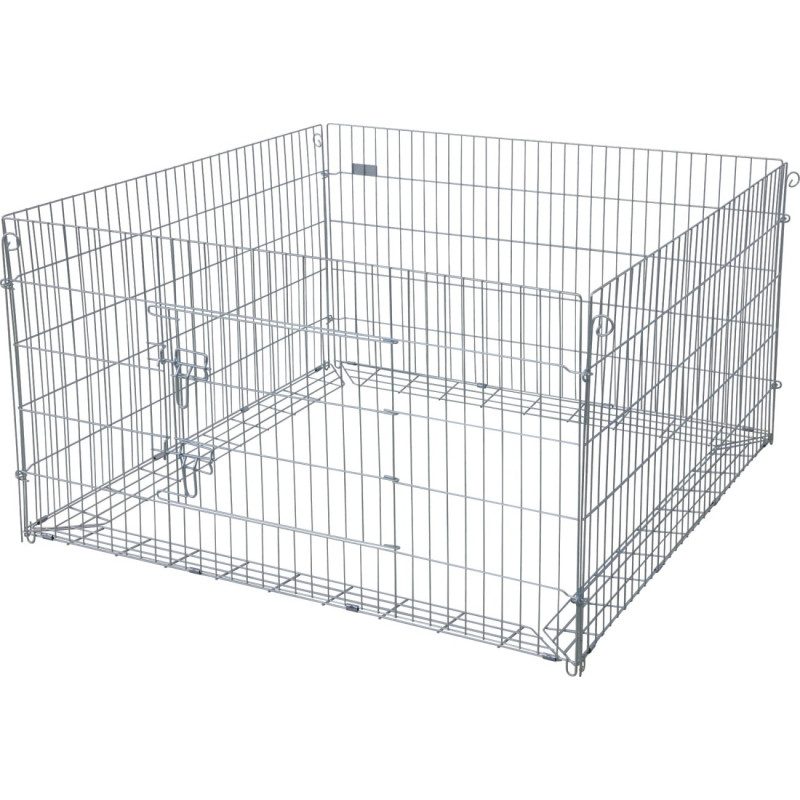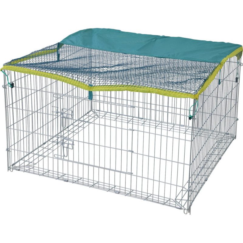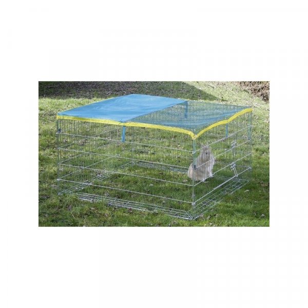 Kovový výběh pro králíky nebo morčata včetně ochranné síťky. Optimální velikost mezer mezi dráty zabraňuje králíkovi se podhrabat a rovněž tvoří efektivní ochranu pro zvířata uvnitř výběhu před napadením psy, kočkami, kunami, ale i dravci. Materiál: Kov