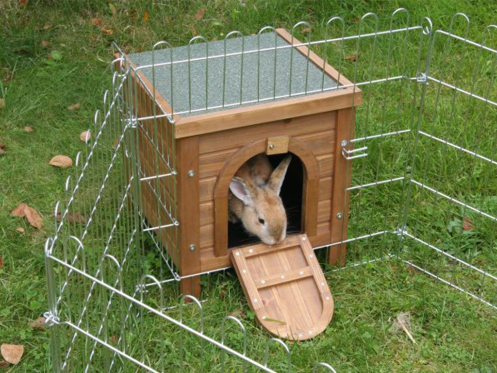 Domek pro zakrslé králíky nebo morčata s uzavíratelným vstupem vhodný také pro venkovní použití.