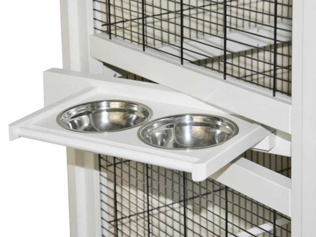 - příslušenství: dvojité krmítko s nerezovými miskami, 4 dřevěná bidélka (2x průměr 10 cm, 2x průměr 12 cm)