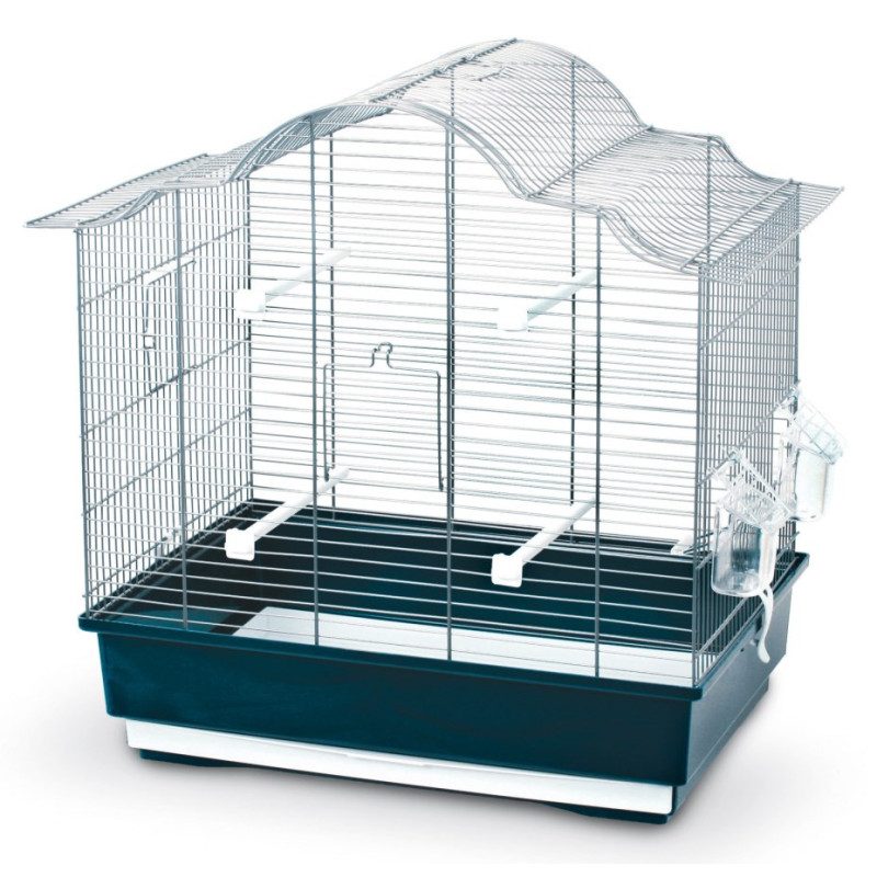 Kovová klec pro ptáky Gabbia Sophia je mřížová ptačí klec v klasickém stylu s bidélky a miskami na krmení a vodu.