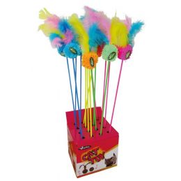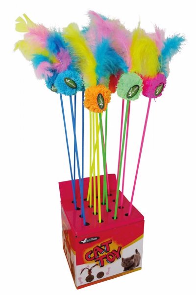 Různobarevné moderní designy hračky (barevné kombinace žluté, modré, růžové a zelené barvy) s chmýřím a peřím na hůlce poslouží jako příjemná a žádoucí hračka pro kočičího miláčka.