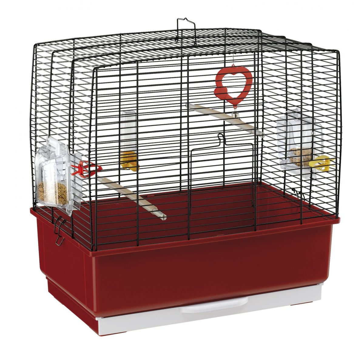 Klec je vyrobena ze zdravotně nezávadného plastu a pletiva potaženého plastem. Dodáváme s výbavou včetně plastových pogumovaných bidel, odnímatelných otočných podavačů Brava 2, láhve na pití, kolíčků na jídlo a zrcadlové hračky.